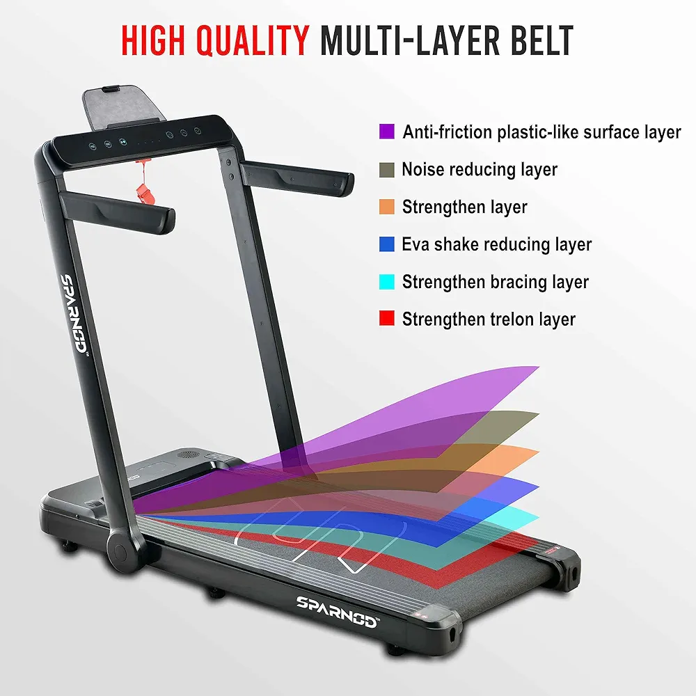 تردمیل تاشو اسپارنود، نازکترین همراه ورزشی شما! طراحی 2 کاره و قابل جمعشدن در زیر تخت یا کاناپه. بدون نیاز به نصب، با موتور قدرتمند 4 اسب بخار. مناسب برای پیادهروی و دویدن در فضای محدود.